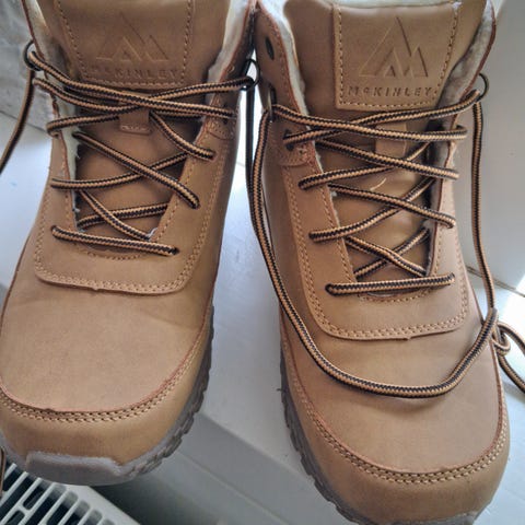 Helt nye (med mærke på og i original æske) ankelstøvler. Vatteret overdel med lamineret effekt. Overdelen er i syntetisk materiale med glat overflade. Snørelukning foran og nederst samt høj skaftkant, der hjælper med at holde sne og kulde ude. Elastisk rem med metalspænde øverst. Trækstrop bagpå. Kraftig gummisål med mønster for bedre fodfæste. Rund snude. Egnet som vinterfodtøj til hverdag og fritid.