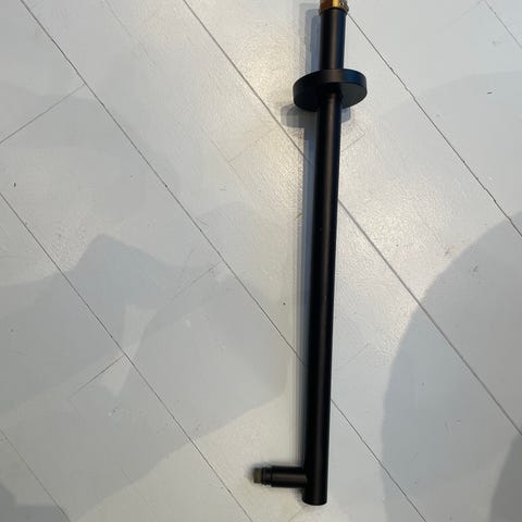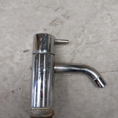 Brusearmatur kort greb. Godt brugt med kalkrester. Der er monteret slange + brusehoved. Uden logo men ligner Vola armaturer. Dimension B:7 X H:14cm