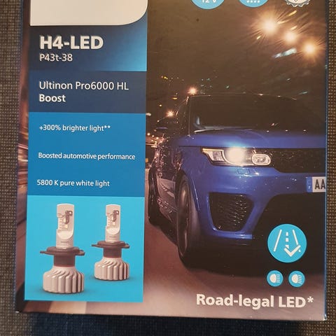 Philips Ultinon Pro6000 HL Boost H7 LED forlygtepærer med PX26d-fatning. Sættet består af to H7-LED-pærer til bilforlygter. Effektforbrug er 15 W pr. pære, og den effektive lysstyrke er angivet til 1550 lumen. Lysfarven er 5800K hvidt lys. Forventet levetid er op til 3000 timer. Pærerne er angivet som lovlige til vejbrug (road-legal LED) og er beregnet til udskiftning af H7 halogenforlygter i kompatible køretøjer.