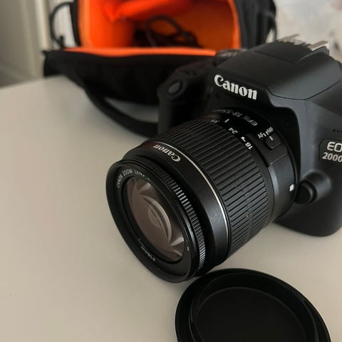 Canon EOS 2000D digitalt spejlreflekskamera med 18-55mm kitlense og taske samt oplader