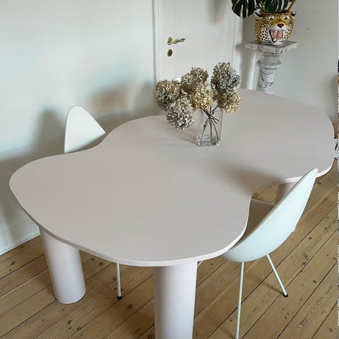 Alessi spisebordssæt i træ. Sættet består af et rektangulært spisebord med træbordplade og lysmalede ben samt matchende stole med krydsryg og flet- eller rørfletlignende sæde. Designet til spisestue eller køkkenalrum med plads til flere personer omkring bordet. Stilrent, klassisk udtryk med træ som gennemgående materiale. Designer: Achille Castiglioni.