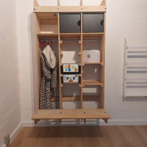 Jeg har for over 10 år siden fået snedkereret dette flotte væghængte garderobearrangement til mine tvillinger. Der er hylder til opbevaring, knager til jakker og tasker, bænk til at side på og hylder til sko. (På billedet ses støvler size 41, en gang kunne der stå flere små par ved siden af hinanden).