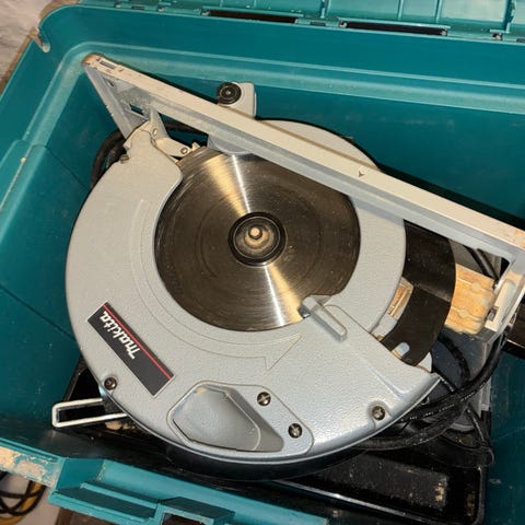 Makita værktøjssæt med rundsav, radio, batterier, lader og topnøglesæt i kuffert