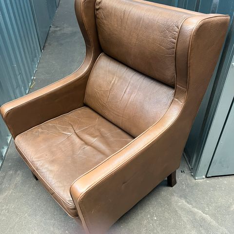Brun læderstol med skammel. Den står rigtig flot uden skræmmer.