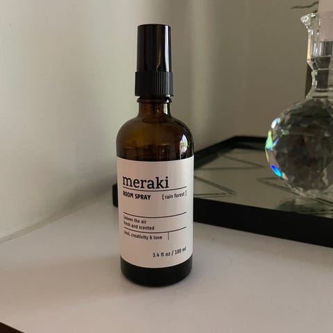 Meraki room spray til opfriskning af indeluft. Leveres i en mørkegrøn flaske med tilhørende hvid æske. Produktet er beregnet til at give duft i rum ved at spraye i luften efter behov. Indeholder brandfarlig væske og dampe og skal opbevares og anvendes i henhold til sikkerhedsanvisningerne på emballagen. Velegnet til brug i f.eks. stue, soveværelse eller badeværelse.