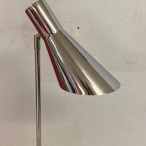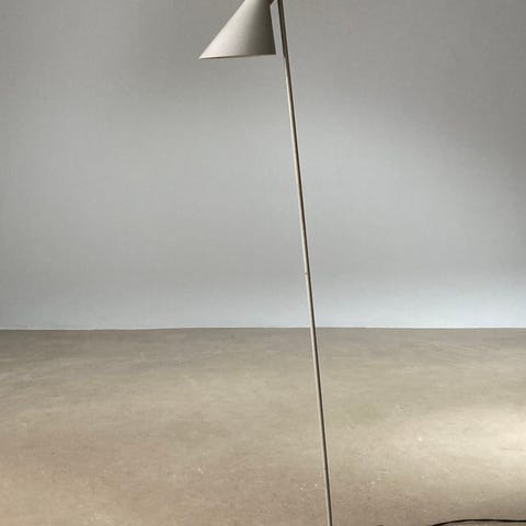Standerlampe. Formentlig Arne Jacobsen Bellevue. Hvid og messing. Brugsmærker på primært fod.