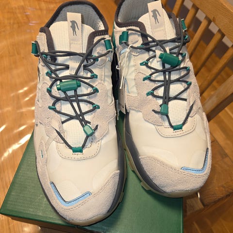 Lacoste Sport træningssæt til herrer i størrelse L. Sættet består af let jakke med lynlås og matchende bukser. Farven er lyseblå med kontrastbånd langs ærmerne og lille Lacoste-logo på brystet samt logo på ryggen. Jakken er regular fit. Materialet fremstår som let og velegnet til sport eller fritid. Bukserne har elastisk linning og Lacoste-logo på låret. Sættet kan bruges til træning eller som afslappet hverdagstøj.