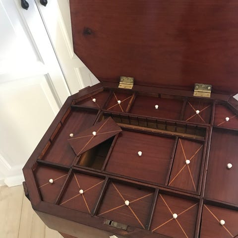 Sidebord med rektangulær bordplade beklædt med dekorative keramiske fliser i lyse og brunlige nuancer. Bordet er udført i træ med mørk brun finish og har slanke, lige ben. Under bordpladen er der en enkelt skuffe på forsiden med rund grebsknop.
