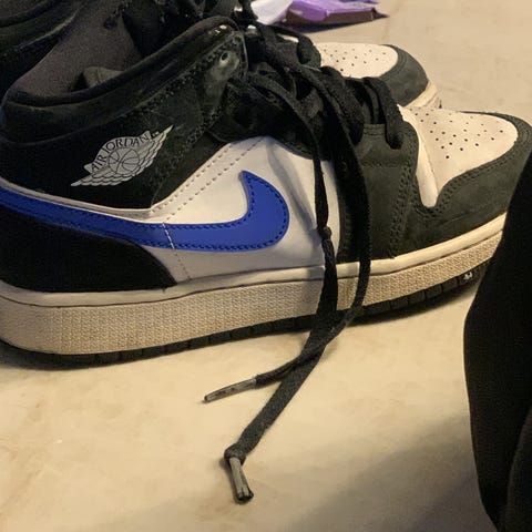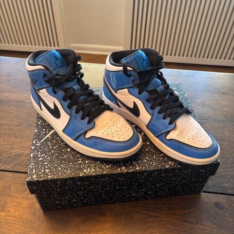 Air Jordan 1 Mid Signal Blue (COLLECTORS ITEM) har en hvid læderbase med blå laklæderdele der giver skoen sit unikke udseende. Der er sorte markeringer langs det blå laklæder der sammen med den sorte Swoosh, snørebåndene, Wings-logo og jumpman-logo giver en detaljeret helhed til skoen.
