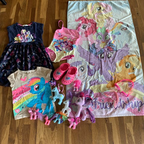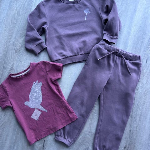 Rigtig fint sæt med Lindex leggings med enhjørninger på knæene. Sweat med fine svaner og flot rosa farve + bluse med My Little Pony.
