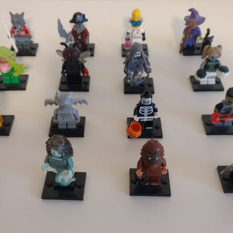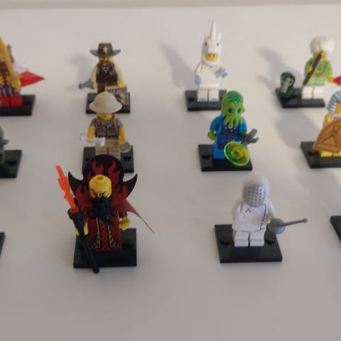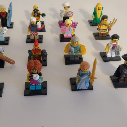Lego minifigurer fra en samleserie. Sættet består af flere forskellige figurer, hver på egen sorte baseplade. Motiverne omfatter blandt andet riddere, fantasifigurer, historiske og moderne karakterer. Figurerne kan bruges som samlerobjekter eller som ekstra figurer til Lego-byggeprojekter og legemiljøer.