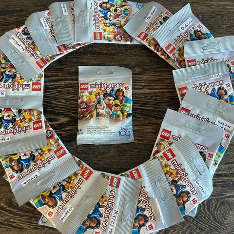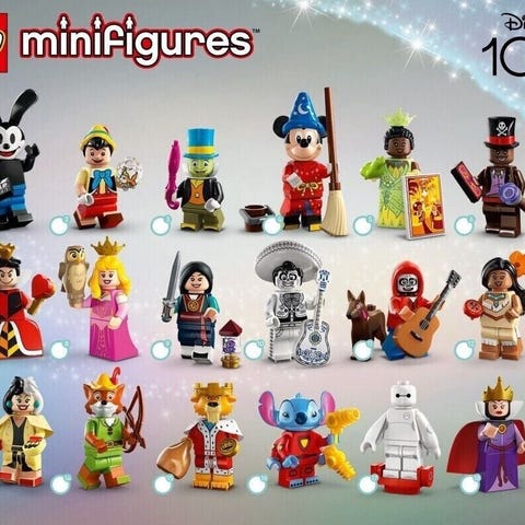 LEGO Disney minifigurer samlesæt. Sættet består af flere forskellige figurer fra Disney-universet, hver monteret på en sort baseplade. Figurerne svarer til dem, der er vist på det medfølgende oversigtsark med numre og illustrationer. Egnet som samlerobjekter eller til leg og udbygning af eksisterende LEGO- og Disney-samlinger.