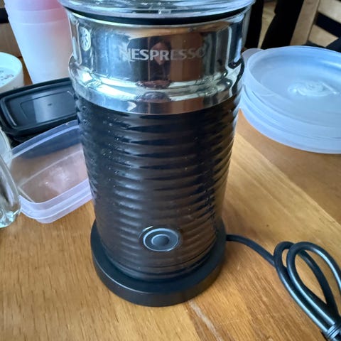 Nespresso mælkeskummer i rustfrit stål. Elektrisk mælkeskummer med base og ledning, egnet til opvarmning og skumning af mælk til kaffe- og espressodrikke. Cylindrisk beholder med håndtag og betjeningsknap på fronten. Passer til brug sammen med Nespresso kaffemaskiner eller andre kaffemaskiner, hvor der ønskes mælkeskum til f.eks. cappuccino eller latte.
