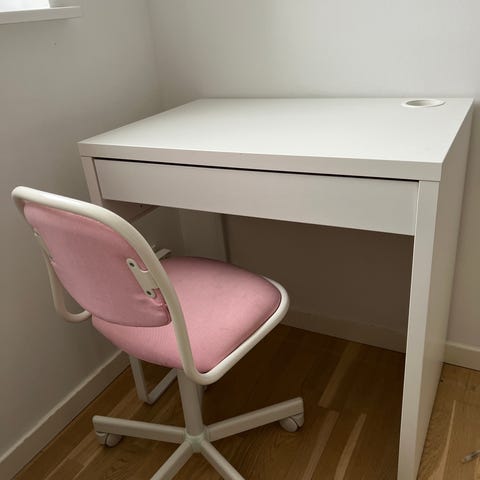IKEA skrivebord og Jysk kontorstol i sæt. Skrivebord i sort med rektangulær bordplade og kabelhul i hjørnet. Under bordpladen er der skuffer til opbevaring af mindre ting. Kontorstolen har polstret sæde og ryg i gråt stof med quiltet mønster på bagsiden samt hvid fod med hjul. Sættet er egnet til brug som arbejdsplads eller studieplads i hjemmet.