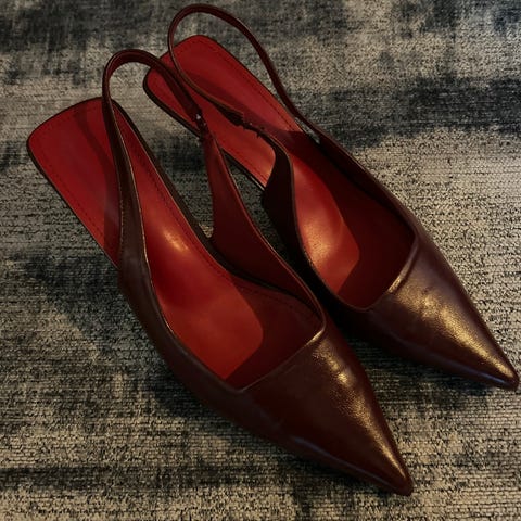 H&M højhælede sko i størrelse 39. Skoene er i en beige nuance med spids snude og slank hæl, som på billedet måler ca. 6 cm. Overmaterialet har en ruskindslignende overflade. Velegnet som klassiske pumps til brug ved både hverdag og mere formelle anledninger.