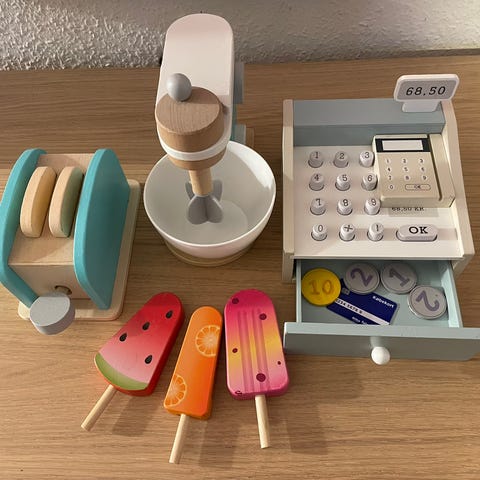 Fint MaMaMeMo køleskab fyldt med forskellige madvarer (også fra MaMaMeMo). Af ældre dato, med få brygsspor, men fejler intet.