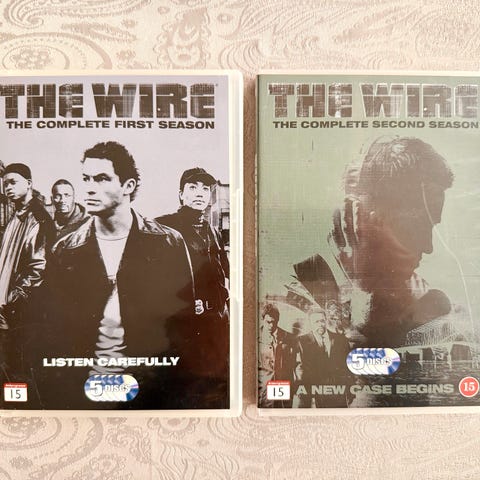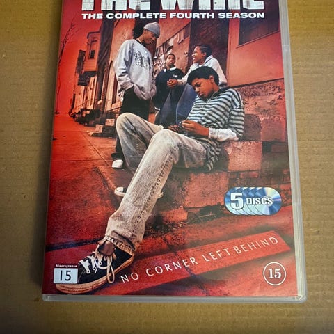 The Wire sæson 4 dvd boks. Indeholder den komplette fjerde sæson af tv-serien fordelt på flere dvd-diske i plastetui. Omslaget viser oplysninger om episoder, sprog og undertekster samt bonusmateriale, som fremgår af billederne. Egnet til afspilning på dvd-afspillere, der understøtter den viste region og format.