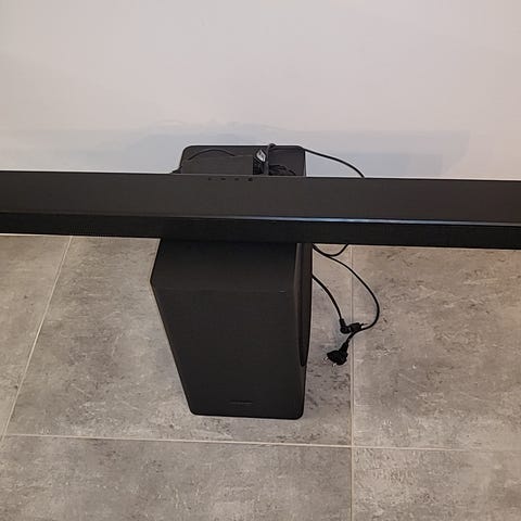Panasonic soundbar med trådløs subwoofer i sort. Systemet består af en lang, slank soundbar og en separat subwooferenhed. Enheden understøtter blandt andet Dolby Atmos og DTS:X ifølge ikonerne på produktbilledet. Soundbaren er egnet til brug sammen med tv og andre lydkilder og kan placeres foran tv’et eller monteres tæt ved. Subwooferen kan placeres frit i rummet for at understøtte basområdet. Systemet har trådløs tilslutning mellem soundbar og subwoofer og understøtter også Bluetooth til trådløs afspilning fra kompatible enheder. Velegnet til hjemmebrug, f.eks. i stue eller tv-rum, hvor der ønskes tv-lyd via ekstern højttalerløsning. Nypris var +5000kr
