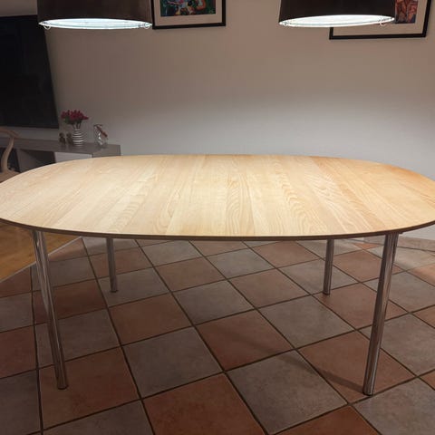 Superellipseformet egetræs bord, med rustfri stålben, incl 2 tillægsplader.