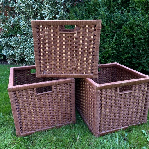 IKEA opbevaringskasse i flettet træ. Kassen har kvadratisk form og er åben foroven, velegnet til opbevaring i reoler eller på hylder. Kan bruges til legetøj, bøger, tøj eller andre småting på børneværelset eller i resten af hjemmet.
