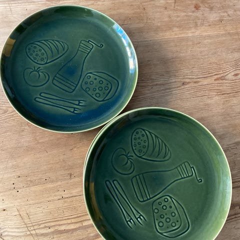 Porcelæn, Tapas tallerkener, Retro, 2 fine gamle franske tapas tallerkener fra 70'erne. De har en lækker grøn farve, og de måler 24 cm.i diameter. De er begge i perfekt stand og de sælges samlet..