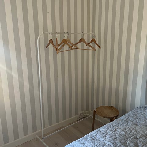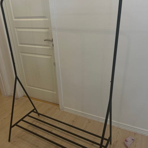 IKEA tøjstativ i sort metal. Stativet har en bøjlestang øverst til ophæng af tøj og en nederste hylde med metalstænger, der kan bruges til sko eller opbevaringskasser. Egnet til brug i entre, soveværelse eller opbevaringsrum. Designet til fritstående placering mod væg eller frit i rummet.