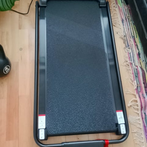 Løbebånd med manuel drift i sort med hvid ramme. Udstyret med håndtag foran til støtte under gang eller let løb. Kompakt model der kan anvendes til træning i hjemmet og kan stilles op mod en væg eller i et hjørne, når det ikke er i brug. Egnet til indendørs brug for én person ad gangen.