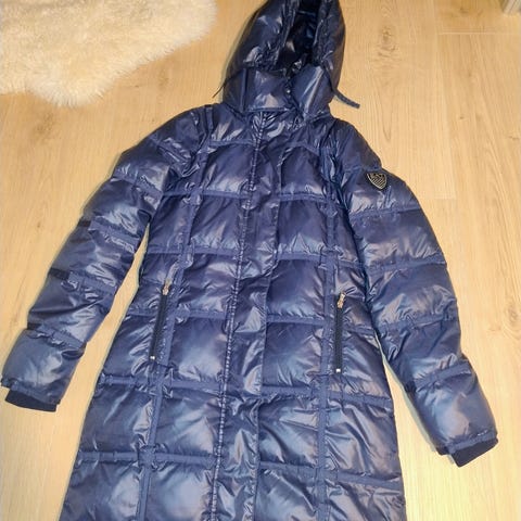 Armani vinterjakke til kvinder i størrelse S. Jakken er blå og foret med dun. Modellen er en længere, quiltet vinterjakke med hætte og gennemgående lynlås foran. Jakken har sidelommer med lynlås og et enkelt, klassisk design egnet til koldt vejr.