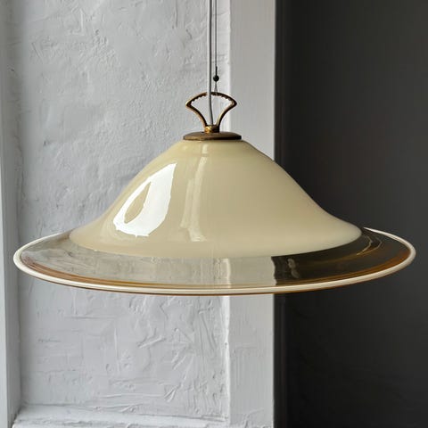 Stor vintage Murano pendel i hvid-stribet glas. Den er fundet i Italien og er i super flot stand uden skår (enkelte diskrete overflade ridser kun - se billede). Den har fået ny frisk ledning på.