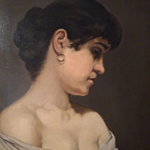 maleri af en kvinde i traditionel beklædning, der hviler sig under en parasol.