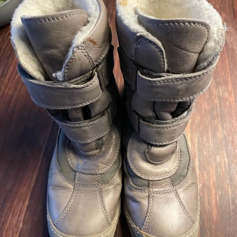 Bisgaard børnestøvler i str. 33 til unisex. Støvlerne er i en mørk/sort farve med velcrolukning foran. Indvendigt er der blødt fór ved skaftet. Overdelen fremstår som robust materiale egnet til udendørs brug. Velegnet kolde dage samt vintervejr. Trænger til en kærlig hånd.