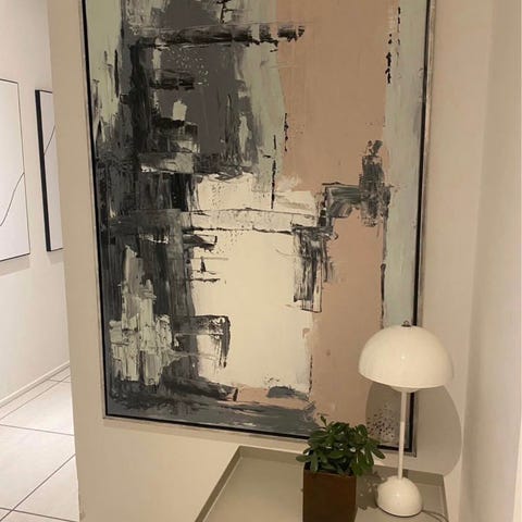 Abstrakt maleri med struktureret Mål 84 X 64 Cm overflade i lyse grå, hvide og beige nuancer med detaljer i guld. Maleriet er rektangulært og indrammet i en sort ramme. Udtrykket er neutralt og kan anvendes som vægdekoration i for eksempel stue, soveværelse . Velegnet til indretning, hvor der ønskes afdæmpede farver og et roligt, abstrakt motiv.