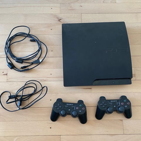 Sony Playstation 3 konsol i sort. Sættet omfatter en trådet controller samt tilhørende kabler til strøm og tilslutning. Medfølgende spil på billedet inkluderer blandt andet FIFA 12, FIFA 14, Gran Turismo og andre titler i både æsker og løse skiver. Konsollen er egnet til afspilning af Playstation 3-spil og understøtter også film og anden medieafspilning via diskdrevet og de tilgængelige porte på fronten.
