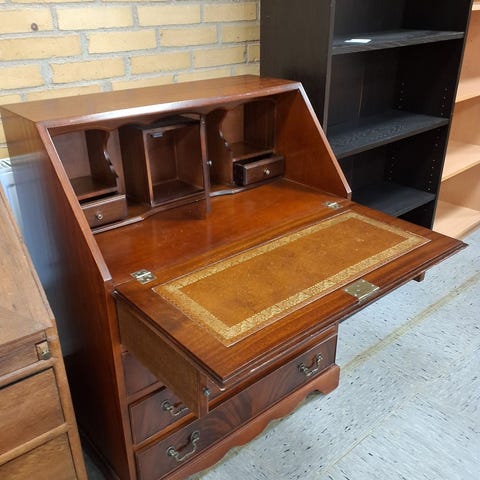 Møblet er en klassisk skrivekommode med tre skuffer, lavet af mørkt træ måske mahogni. Den har messinghåndtag og en hængslet top. Indvendig små. skuffer og "hemmelige" rum,Afhentes i:,Røde Kors Sorø (335),Bemærk at mail, chat og beskeder ikke besvares, og varen skal købes på knappen "Gå til varen"