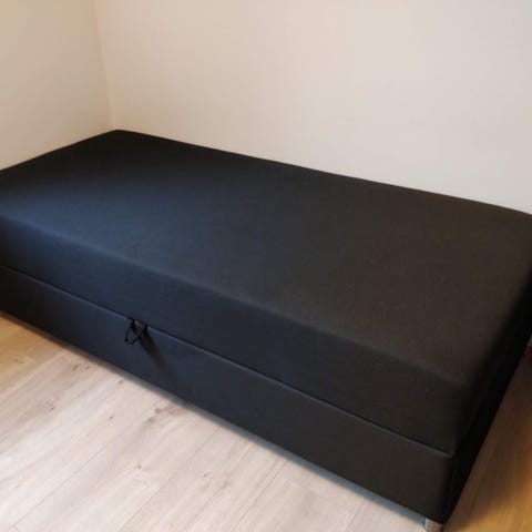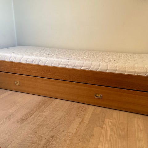 Madrassen har en grå overflade med knapdetaljer. Polstret skumgummimadras. Små træben.