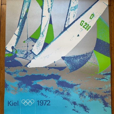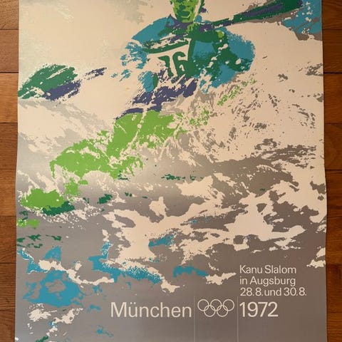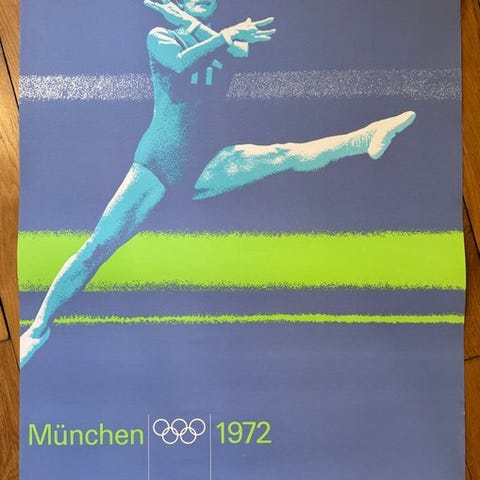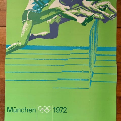 Plakaten (84 cm høj x 60 cm bred) er et originalt offsettryk fra trykkeriet Gerber på mat papir fra år 1972. Fotomotivet stammer fra Longines. Det viser 100 meter løbet og er et af flere motiver for de forskellige sportsgrene i det ikoniske designkoncept for Olympiske Lege i 1972 af Otl Aicher (1922-1991).