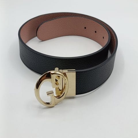 Bæltet er i læder med en mørk brun forside og en sort bagside – spænden med monogrammønsteret "GG" er i forgyldt metal, vendbar.