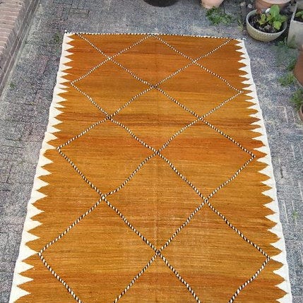 Dette ægte nye marokkanske Berber-tæppe er et Beni Ourain lavet af Atlas-stammerne i Marokko. Med et fantastisk moderne design med farver og mønstre som ingen kan matche, er det et fejlfrit eksempel på, hvad de ægte Berber-tæpper handler om. Frit for skader, dette tidløse moderne design bliver meget populært.