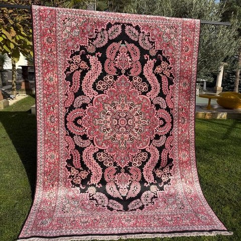 Dette tæppe er et traditionelt håndknyttet mesterværk, hvor hver knude er omhyggeligt og enkelt knyttet ind i tæppets struktur.