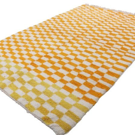 Dette ægte nye marokkanske Berber-tæppe er et Beni Ourain lavet af Atlas-stammerne i Marokko. Med et fantastisk moderne design med farver og mønstre som ingen kan matche, er det et fejlfrit eksempel på, hvad de ægte Berber-tæpper handler om. Frit for skader, dette tidløse moderne design bliver meget populært.