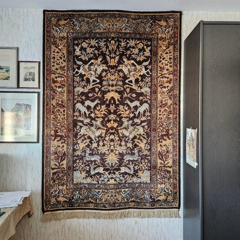 Det tæppe er fuldt håndknyttet i ren silke (silkeplet og silkegrund), hvilket får farverne til at skinne livligt, og detaljerne er usædvanligt skarpe.