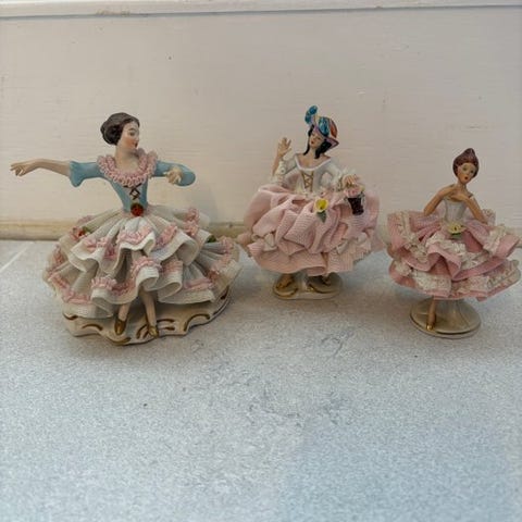 Elegant porcelænstatuette fra den prestigiøse tyske fabrik Scheibe-Alsbach, beliggende i Thüringen. Denne genstand forestiller en dame af høj adel i galaudstyr, udført med teknikken 'porcelænsbroderi' (Dresden Lace), hvor flydende porcelæn påføres over ægte blonde, der forsvinder ved bagningen og efterlader kun det sarte net af keramik.