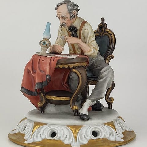 Figurin i polykrom porcelæn af Carl Thieme, Potschappel, fra det 20. århundrede, der forestiller børn nær ilden. Selvom det er tysk porcelæn, efterligner mærket Capodimonte.