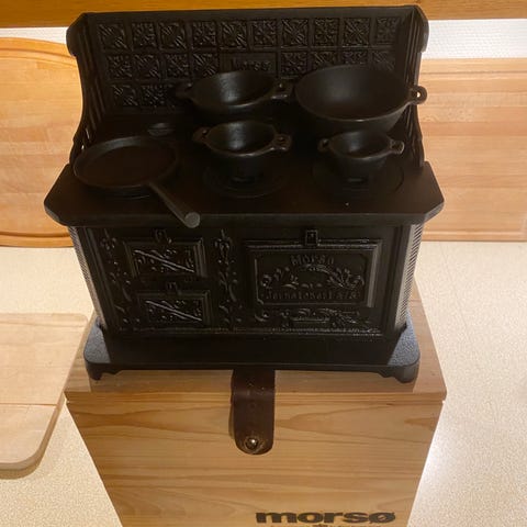 Gammelt støbejernskomfur med hylder med tilbehør til røgrøret, placeret internt.