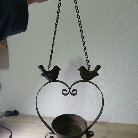 Et smukt jernvægornament. Et træ, livets træ. Med to forelskede fugle i midten. Naturlig og landlig vægdekoration. Meget smukt til både indendørs og udendørs brug.