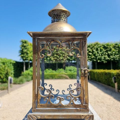 Dette er en meget smuk lanterne. Den er lavet af metal med en flot finish og ser særligt smuk ud, når den er tændt af et stort stearinlys.