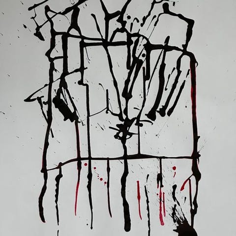 The Monthly Battle er et udtryksfuldt, nutidigt mixed-media-værk udført på papir i A2-format (ca. 42 × 59,4 cm), præsenteret i liggende orientering. Underskrevet på bagsiden.