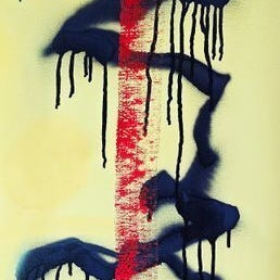 Kompositionen er opdelt i to kontrasterende kromatiske felter, hvilket skaber en visuel spænding mellem modsatrettede kræfter. På den ene side indrammer varme gule nuancer en rå, næsten primitiv figur gengivet med dristige konturer og forenklet anatomi. På den anden side rummer en levende pink baggrund abstrakte tegn, maske-lignende former og grafiske elementer, der antyder konfrontation, ritual eller indre konflikt. Den stærke brug af