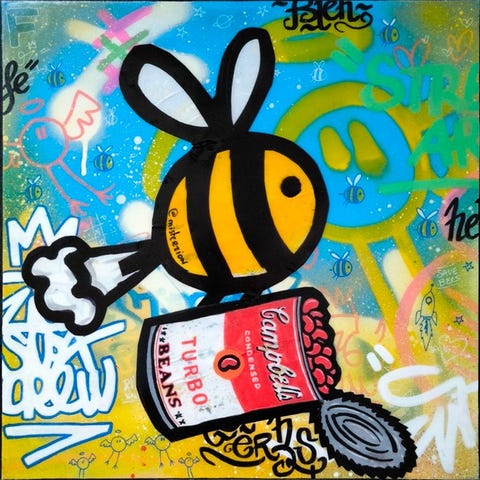 Lærredet er malet i ånden af en væg bestående af flere graffiti, lag og skrifter. La Zabeille i malet craft-papir er limet på den malede lærred, og det hele er dækket af solventfri harpiks. Resultatet er blankt og glat, lidt som en keramisk flise.