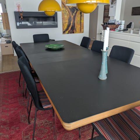 Spisebord i rektangulær form med sort bordplade og sorte ben. Bordet står på skråtstillede ben i metal og har en glat overflade, der egner sig til spiseområde eller mødelokale. Designet giver plads til flere stole omkring bordet og passer ind i et moderne interiør.